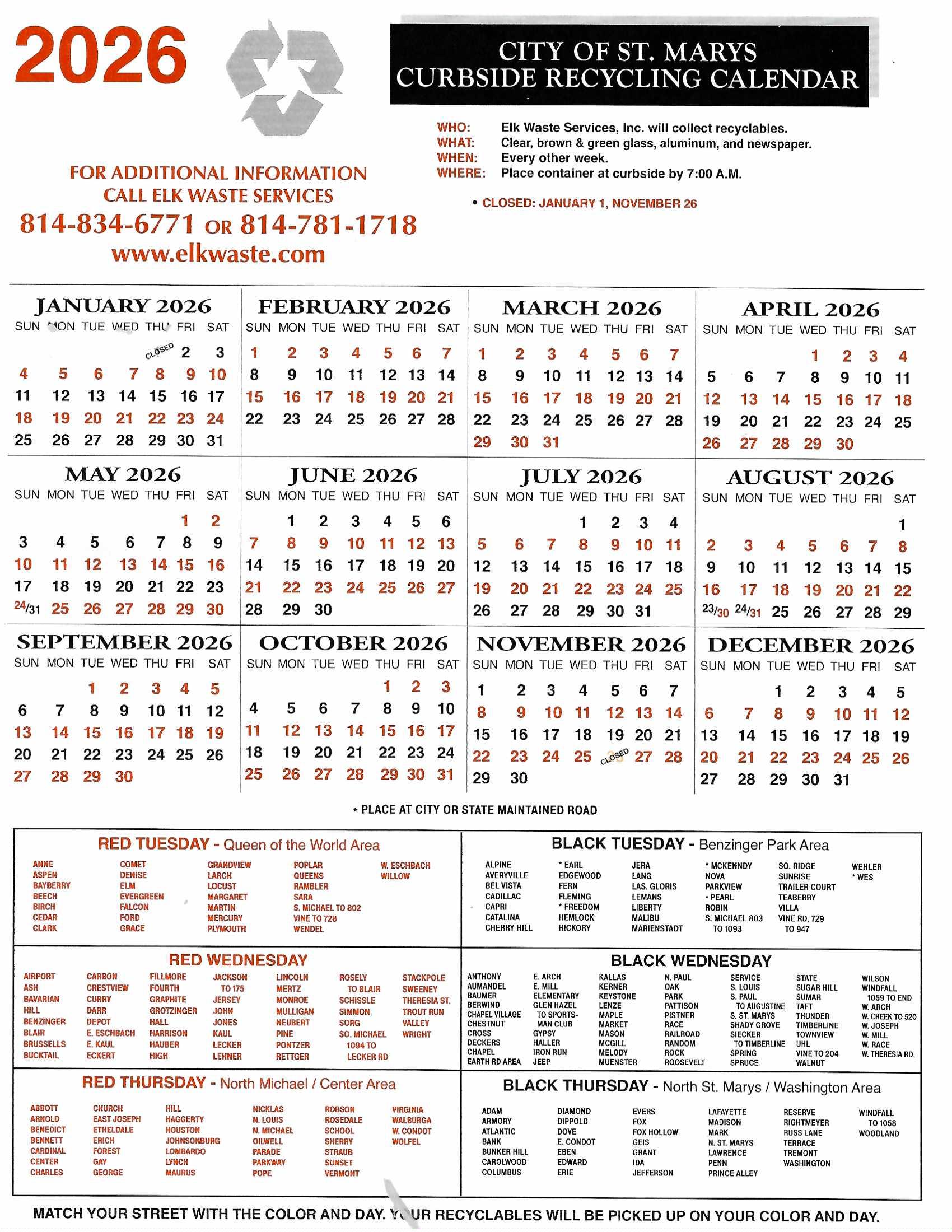 The City of St Marys has contracted Elk Waste Services to do the curbside collection of recyclables. What and when they are collected is as follows: